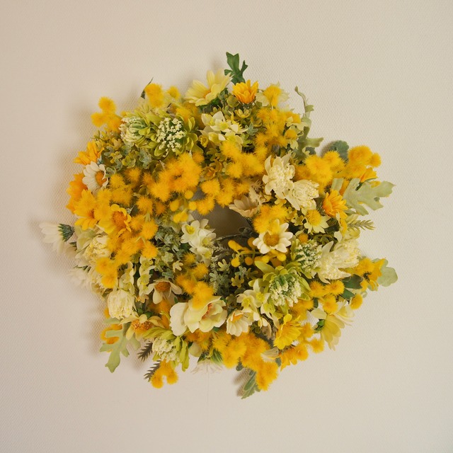 ◇アーティシャルフラワー ◇Spring wreath 春のリース4つめは、ミモザ、カモミール、ベビーブレス、草々野々花を摘みとったようなナチュラルなリース。春の穏やかな暖かみと大胆で野生的な一面をハンドメイドで作り出した大きめのリースです。木調ベースの壁や店舗に映える仕上がりです。 ◇SIZE:H50×W52×D17 (一番外側の葉のまでの計測) ◇作者:仁後真理子(にごまりこ)