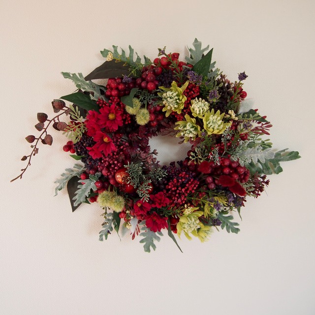 ◇アーティシャルフラワー ◇ 赤い実にたくさんの小花をあしらったボリューミーなリースです。色合いも、鮮やかながらもシックで絵描きである作者の絵に通じる作品ですね。作者の描いた絵本にも出てきそうな雰囲気。絵本を見てリースを見て楽しむなんていう楽しみ方も素敵かもしれません。 ◇SIZE:H23×W33×D09 ◇作者:仁後真理子(にごまりこ)