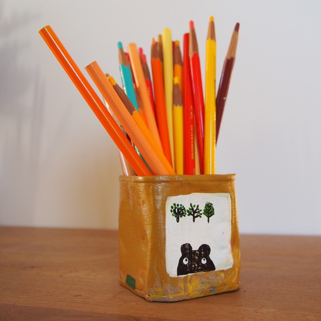 ◇can box 002 ◇どこにでもあるcanを使ってハンドメイドのcan box。おしゃれな鉛筆立てのようにも使えたり、底には水抜きの穴がついているので小さなプランターとしてもつかえます。デスクの上にこんな鉛筆立てがあるだけで幸せな気分になります。絵柄は半分顔を出して森を覗くクマさんと小さな家が描かれています。2013年4月の作品 ◇素材:can