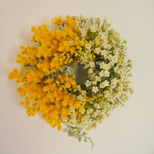 ◇アーティシャルフラワー ◇Spring wreath ミモザ&ベビーズブレスたっぷりのhalf &half wreath 。お部屋に飾る大きさとしてはジャストサイズな春のwreathです。私もこんなのが欲しかったんですよね。ふわっと幾重にも重ねた贅沢なwreathです。 春を感じるアーティシャルフラワーのwreathは、どんなお部屋にもパッと春がやってきます。 ◇SIZE:H30×W27×D12 ※H30は下側の葉までです ◇作者:仁後真理子(にごまりこ)