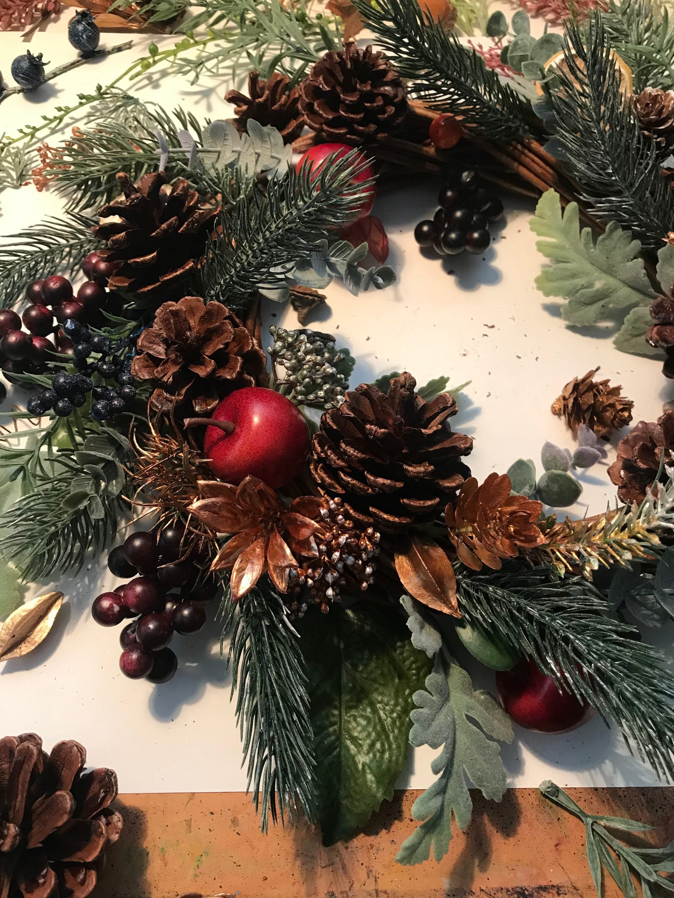 ◇アーティシャルフラワー ◇作者さん8作目となる創作リース。絵や絵本を手掛ける作者らしいリースで私も一目ぼれした作品です。まるで絵本の中に登場するような、深い森の奥に分け入り見つけた小人の家の玄関にかかっているような雰囲気ですね。 ◇りんご、洋梨、ブルーベリー、ラズベリー、松ぼっくり、ユーカリの実などの木の実と 小花をあしらったリース ◇SIZE:H26×W36×D⑪ ◇作者:仁後真理子(にごまりこ)