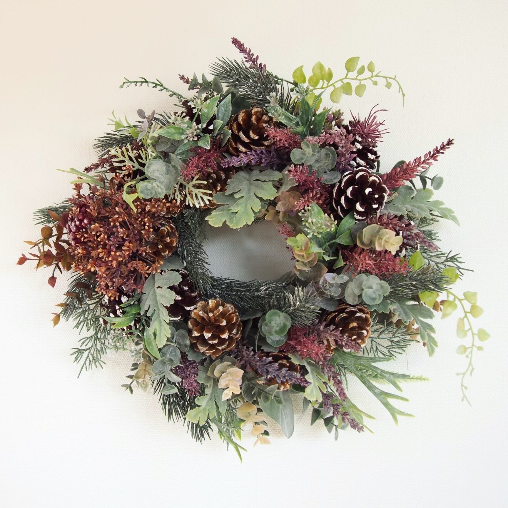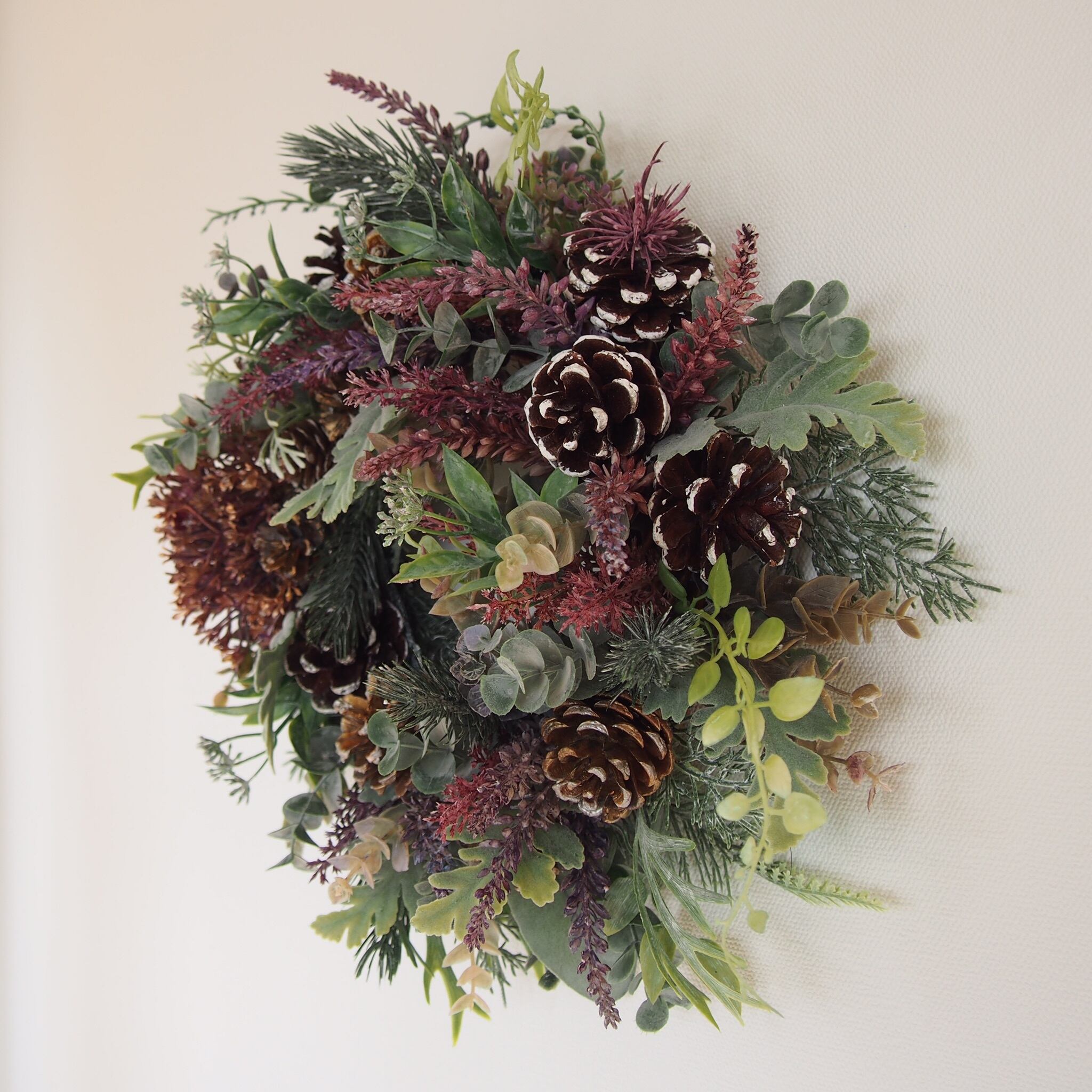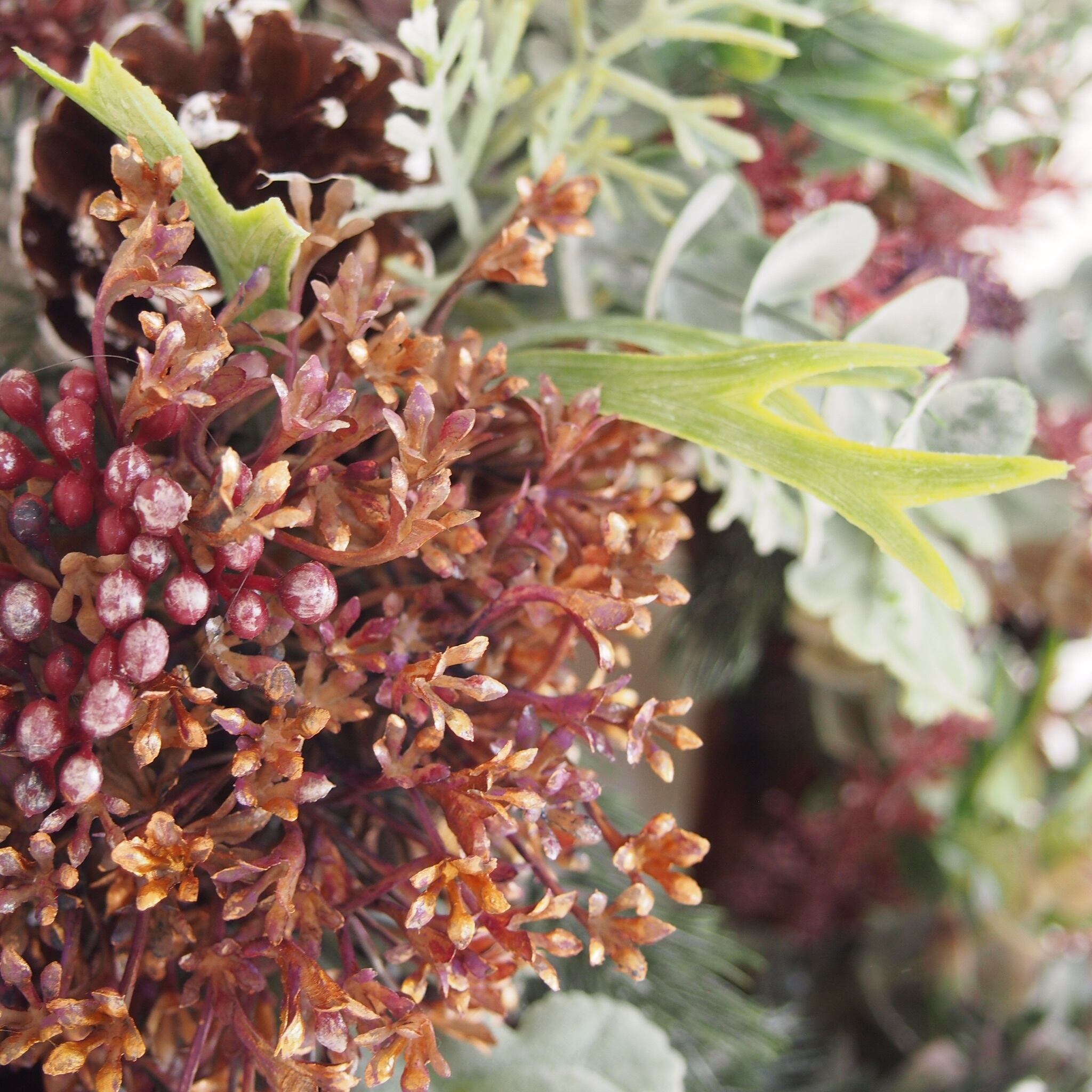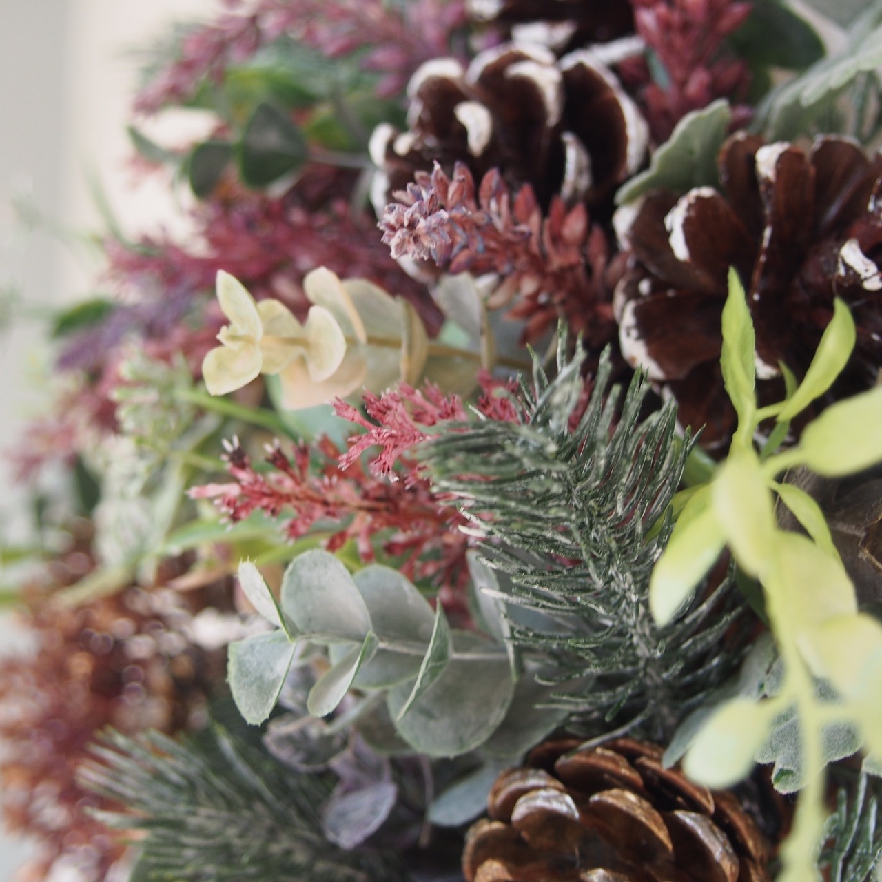◇モミやオーク、ヒバ、ユーカリのグリーンと、松ぼっくりなどのブラウン系とバランスを取った作品。