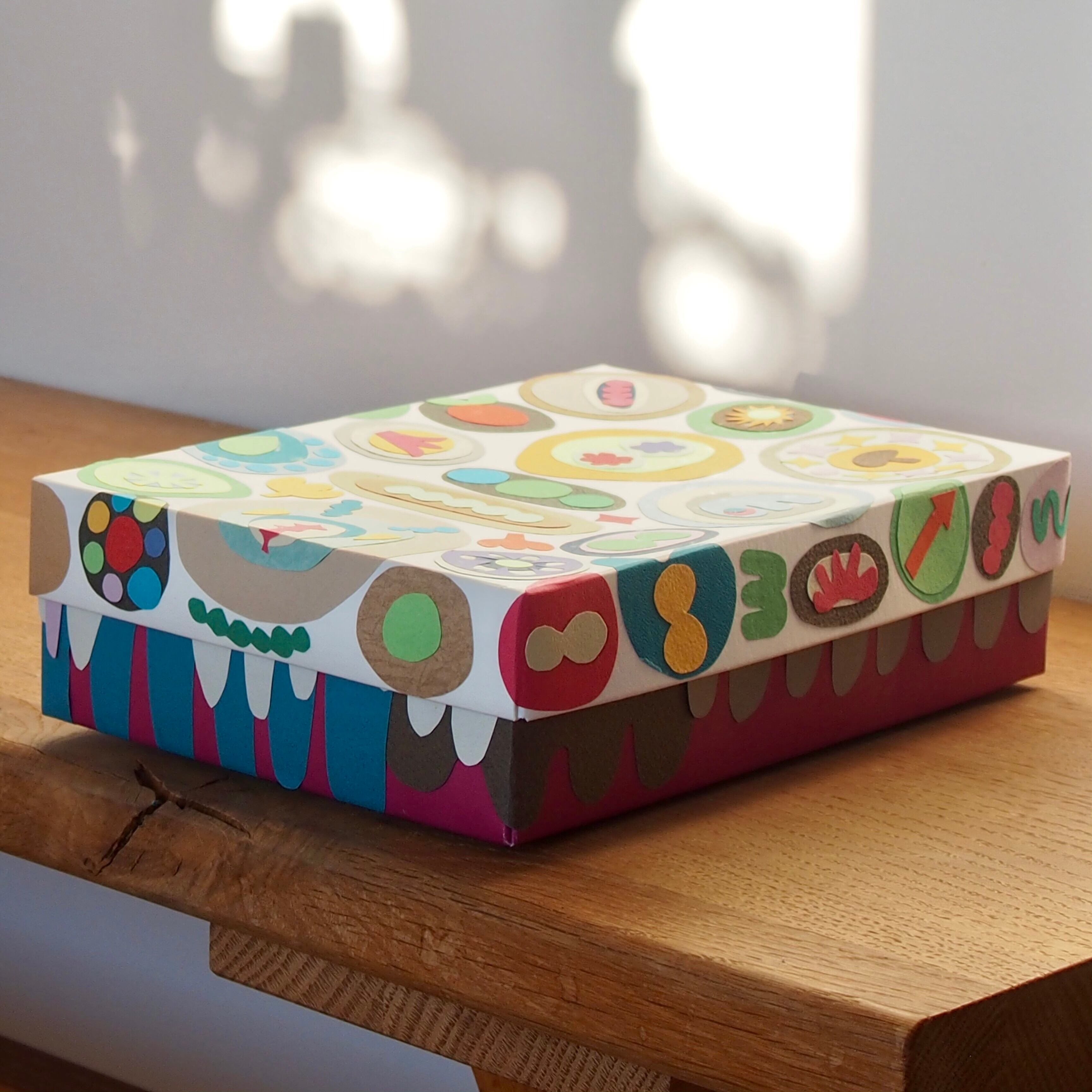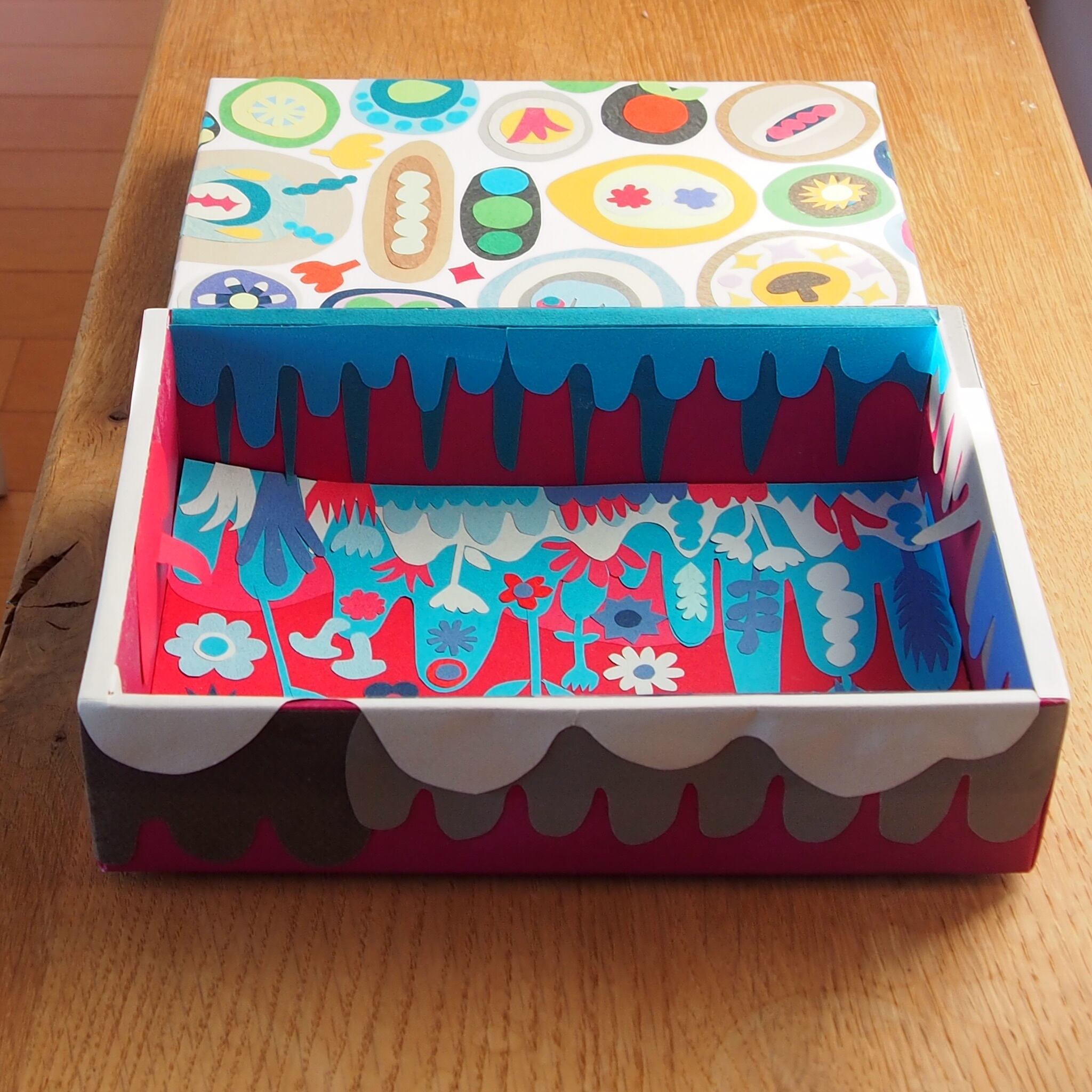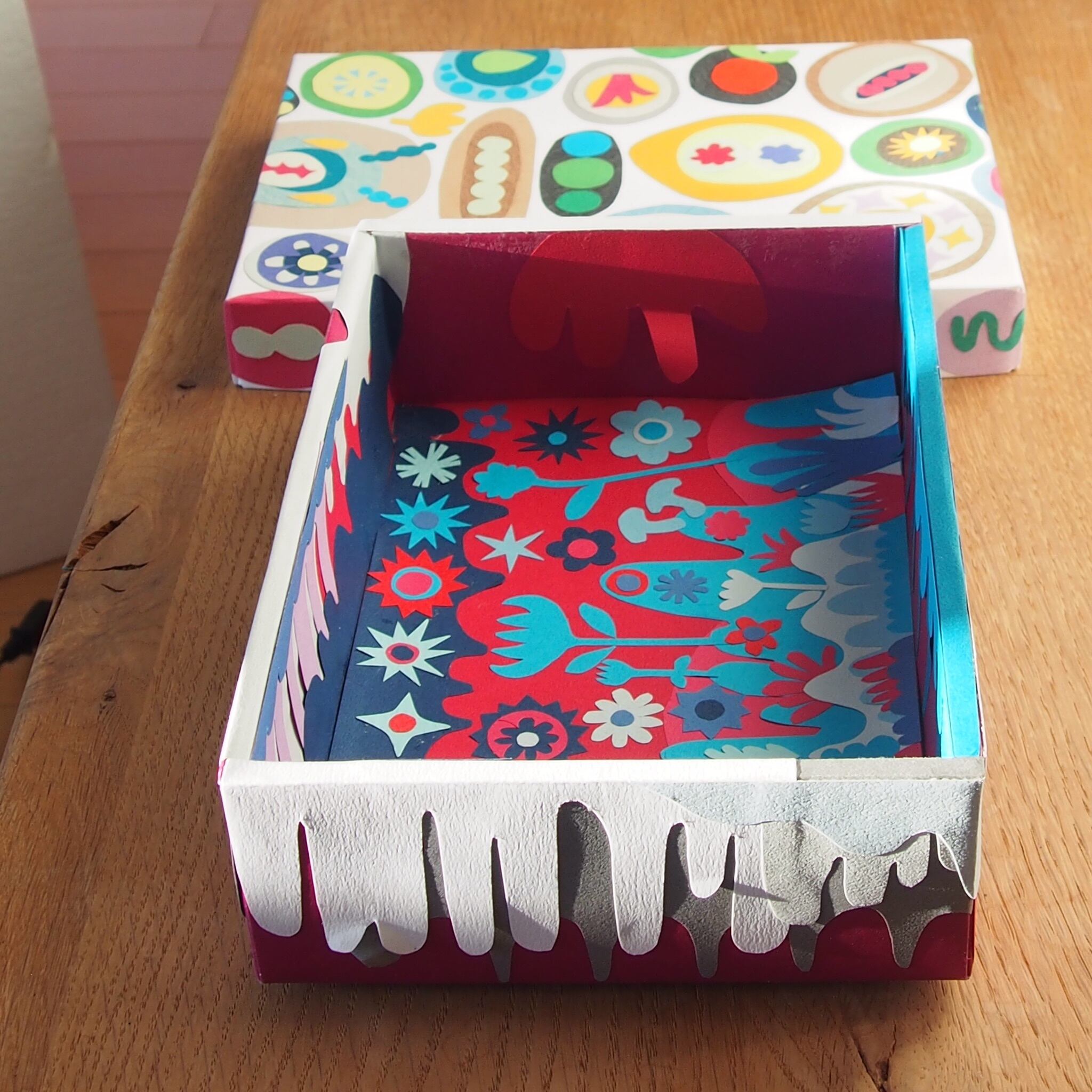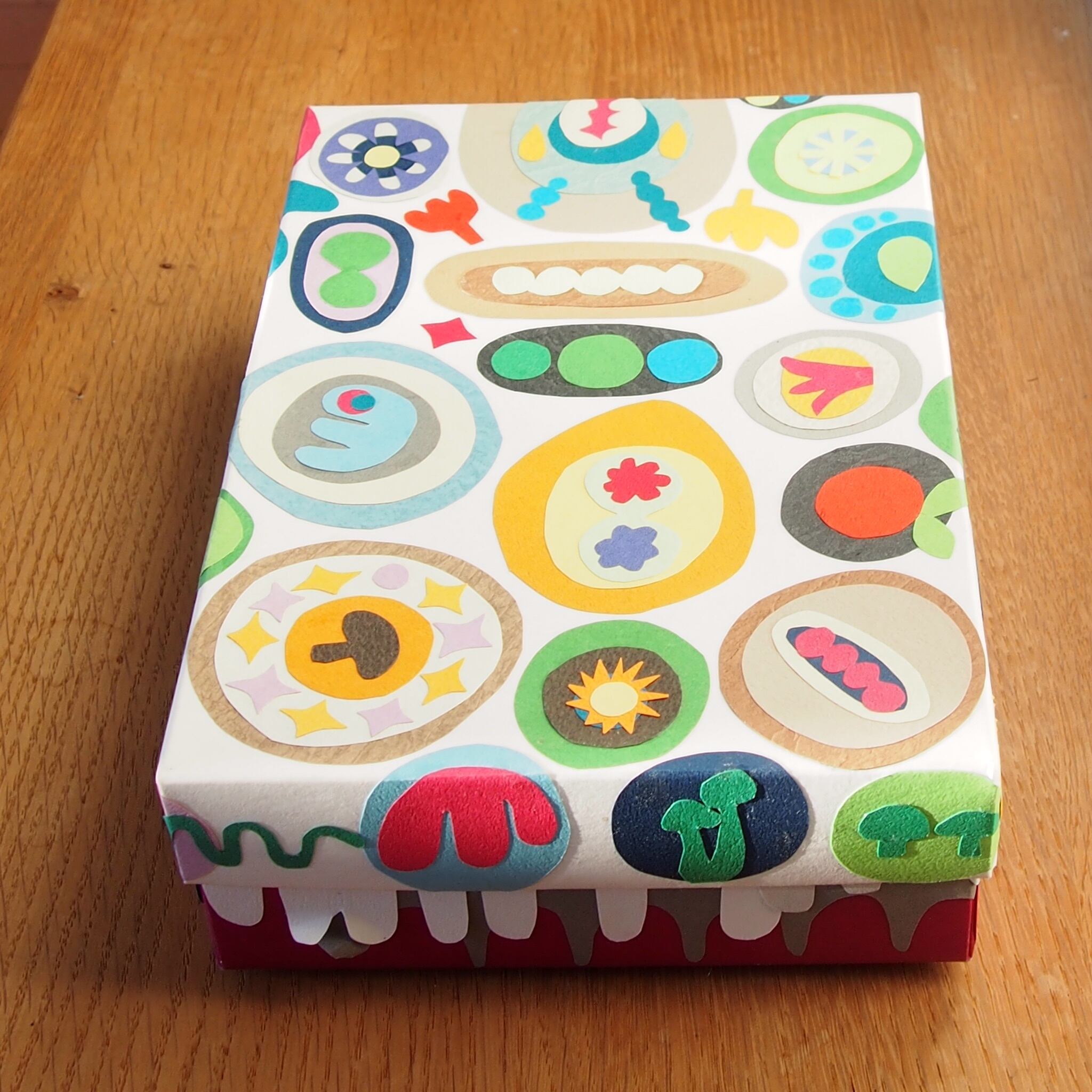 ◇こちらも個展に出展していた作品。作者の手によって貼り絵で装飾されたpaper box。作者の仁後真理子(にごまりこ)さんの創作は本当に不思議です。モチーフがある訳ではなく、手を動かしながら材料を見ながら創りあげていくそうです。そんな魅力がたくさん詰まった世界に1つの作品です。