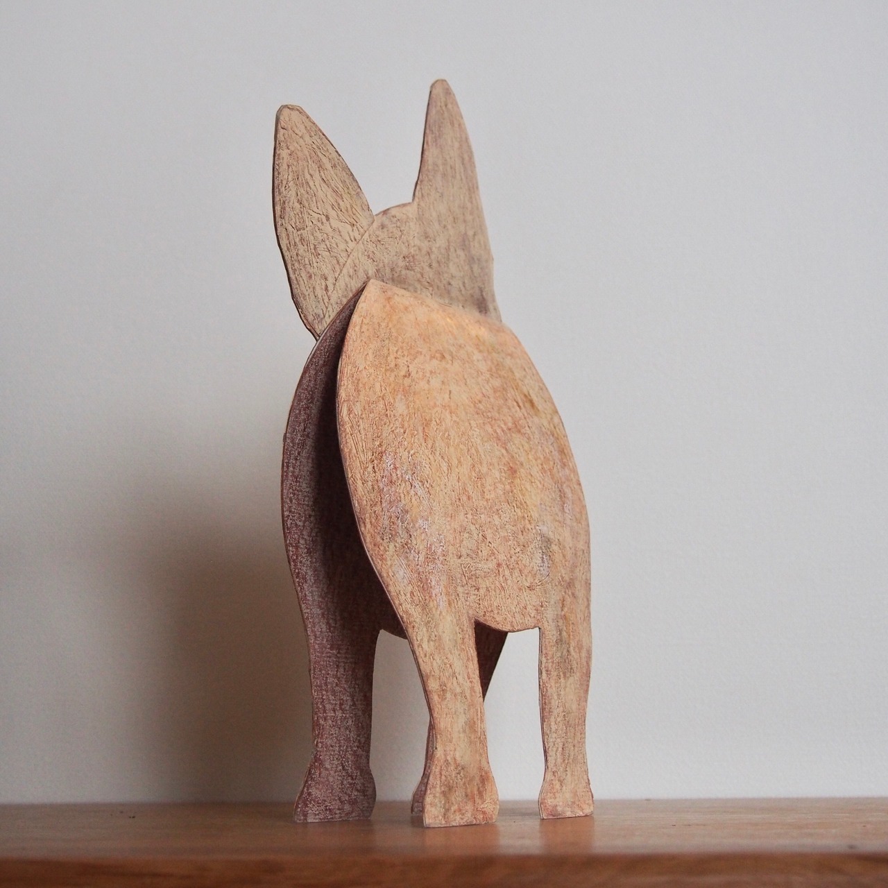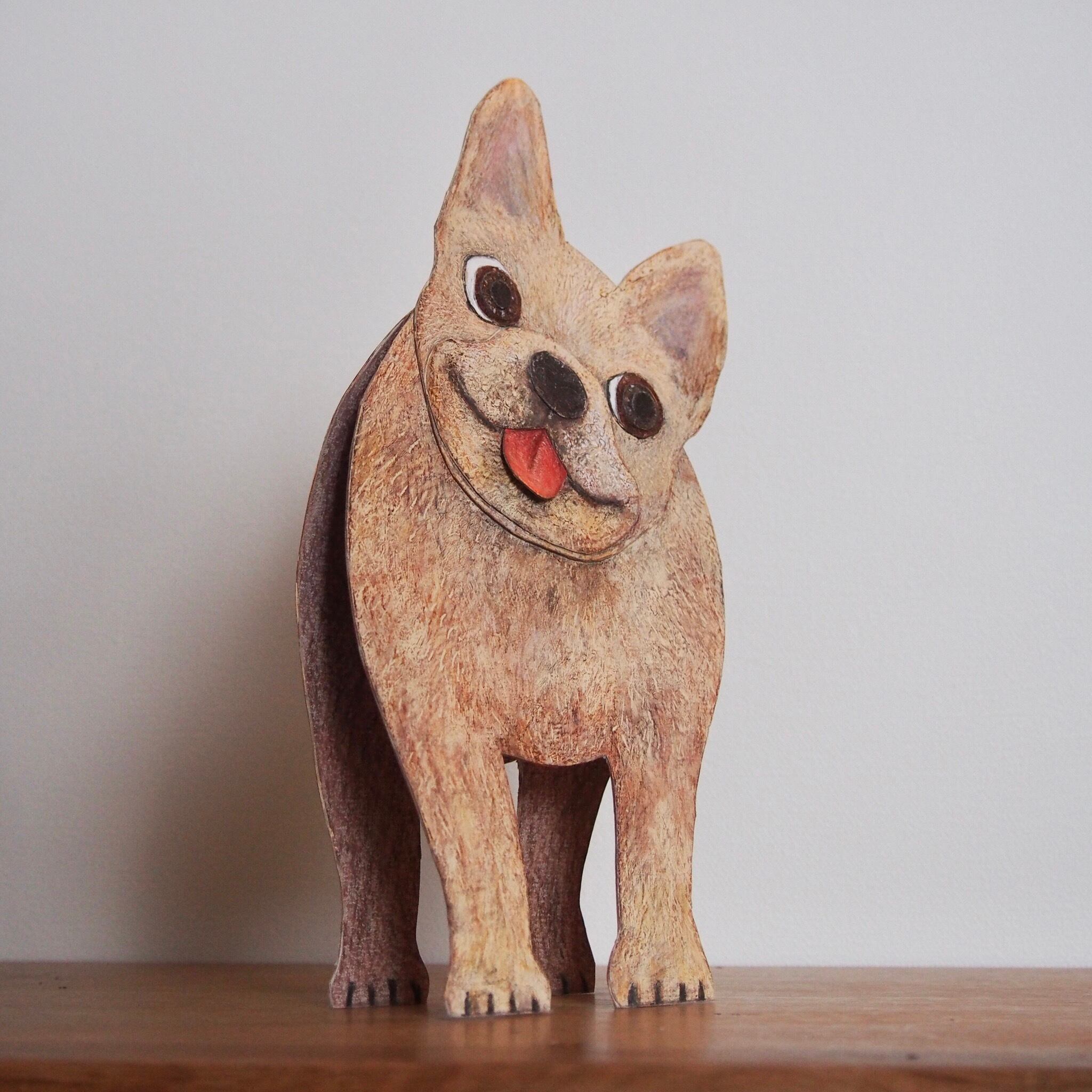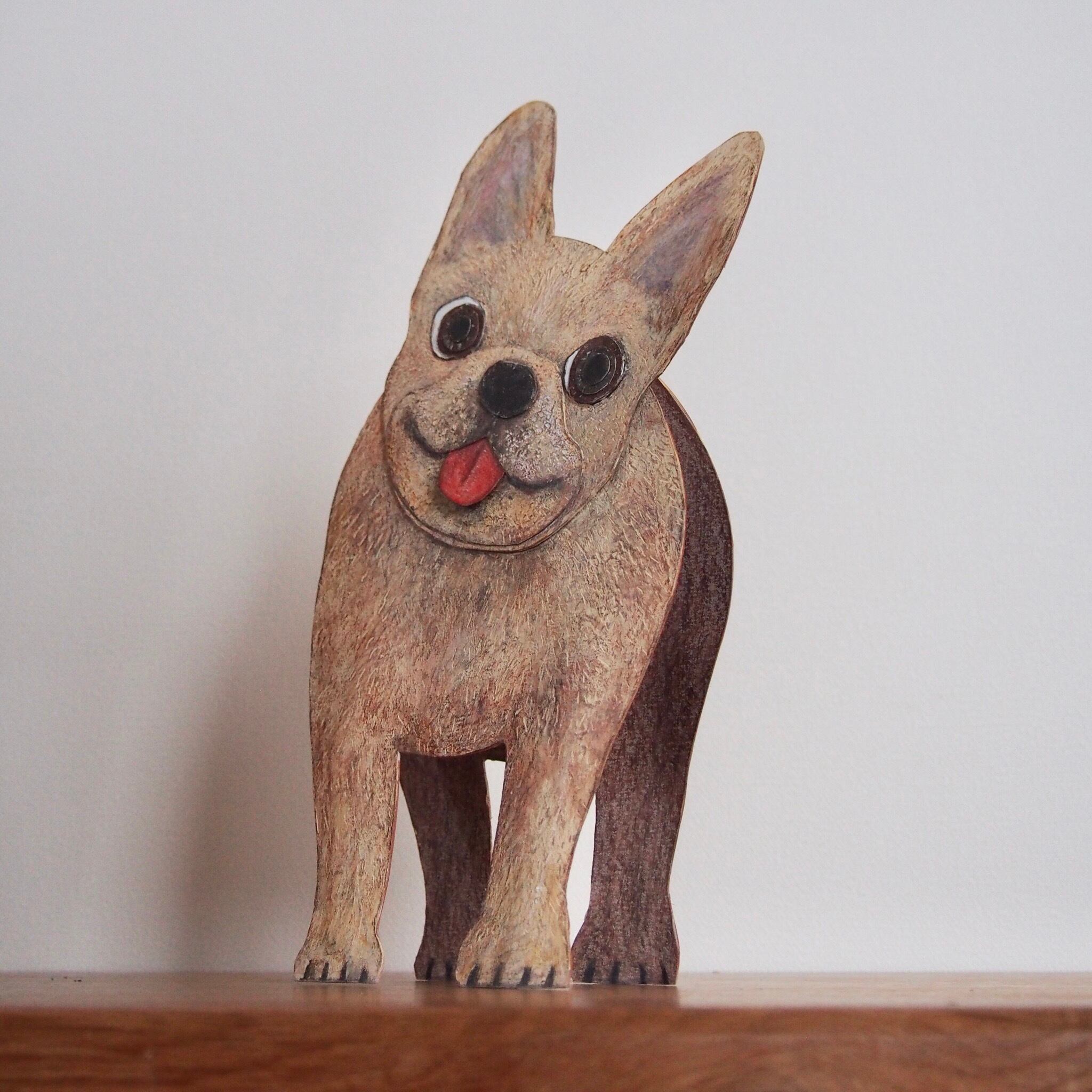 ◇かわいいfrench bulldog を厚紙で作られた作品です。なんともかわいい表情が愛おしくなります。どの角度でも目が合うのでずっ〜と見つめられるです。