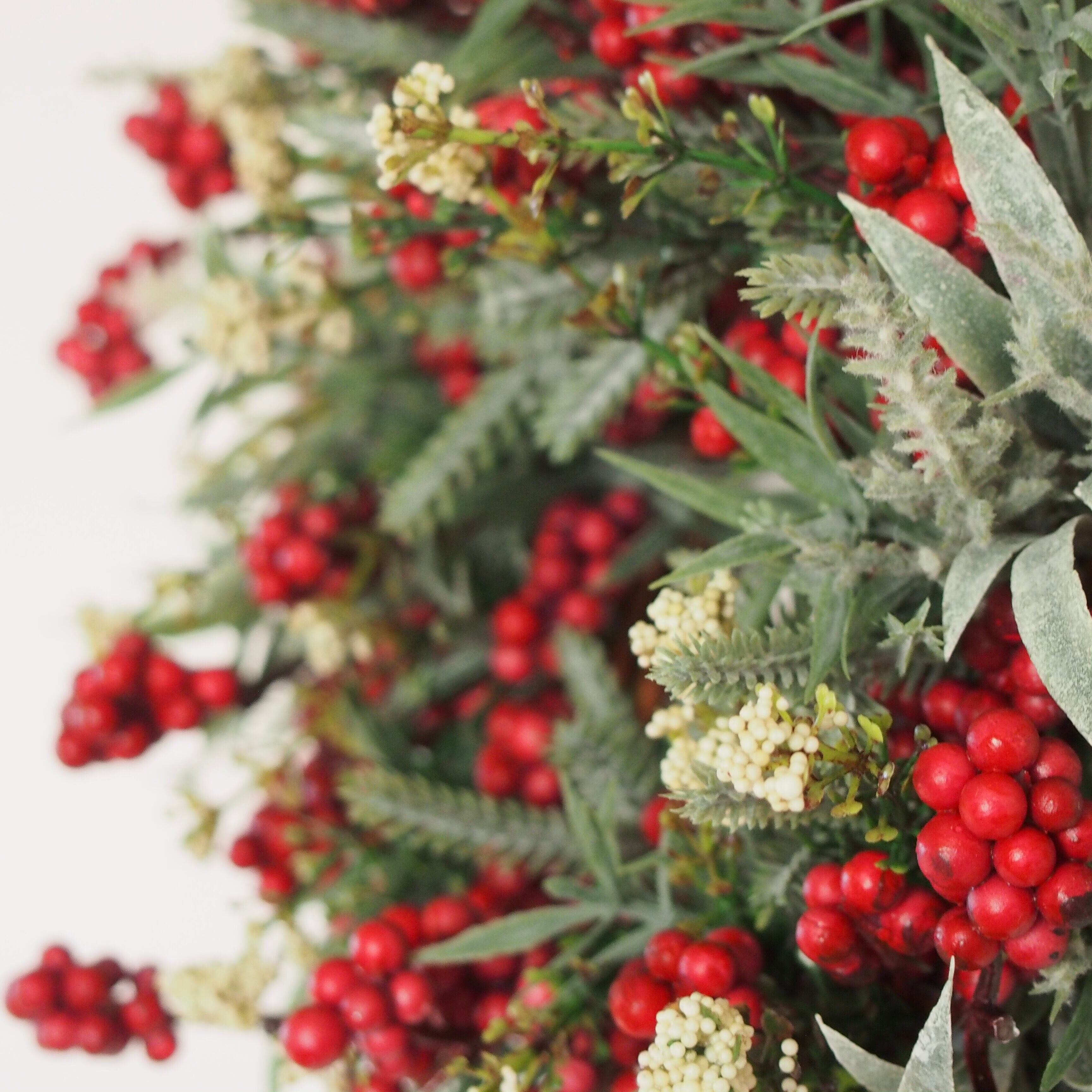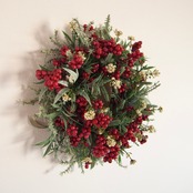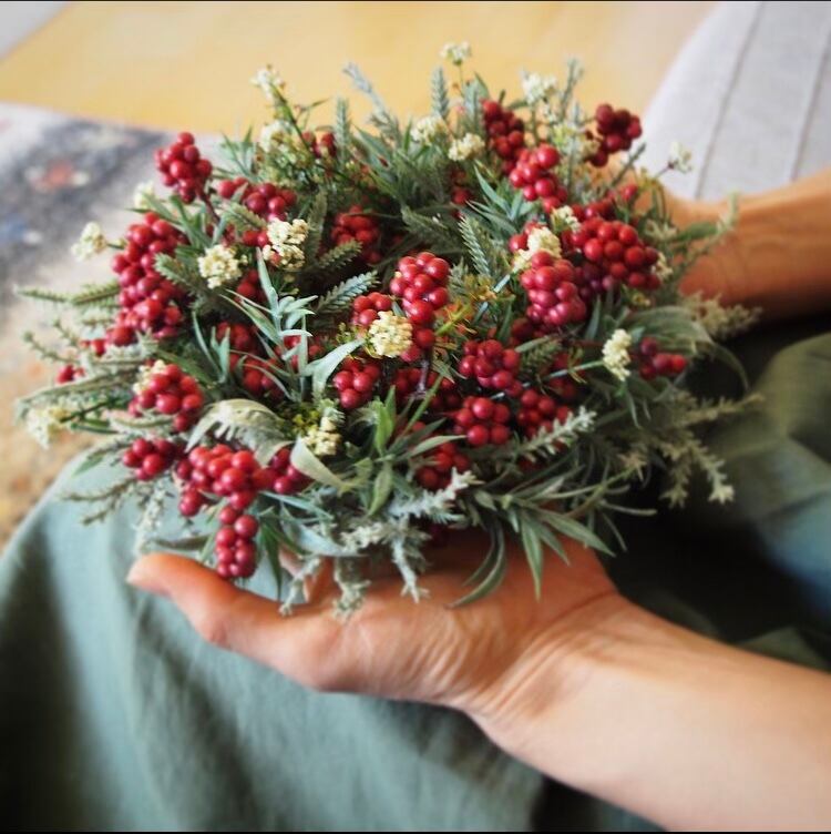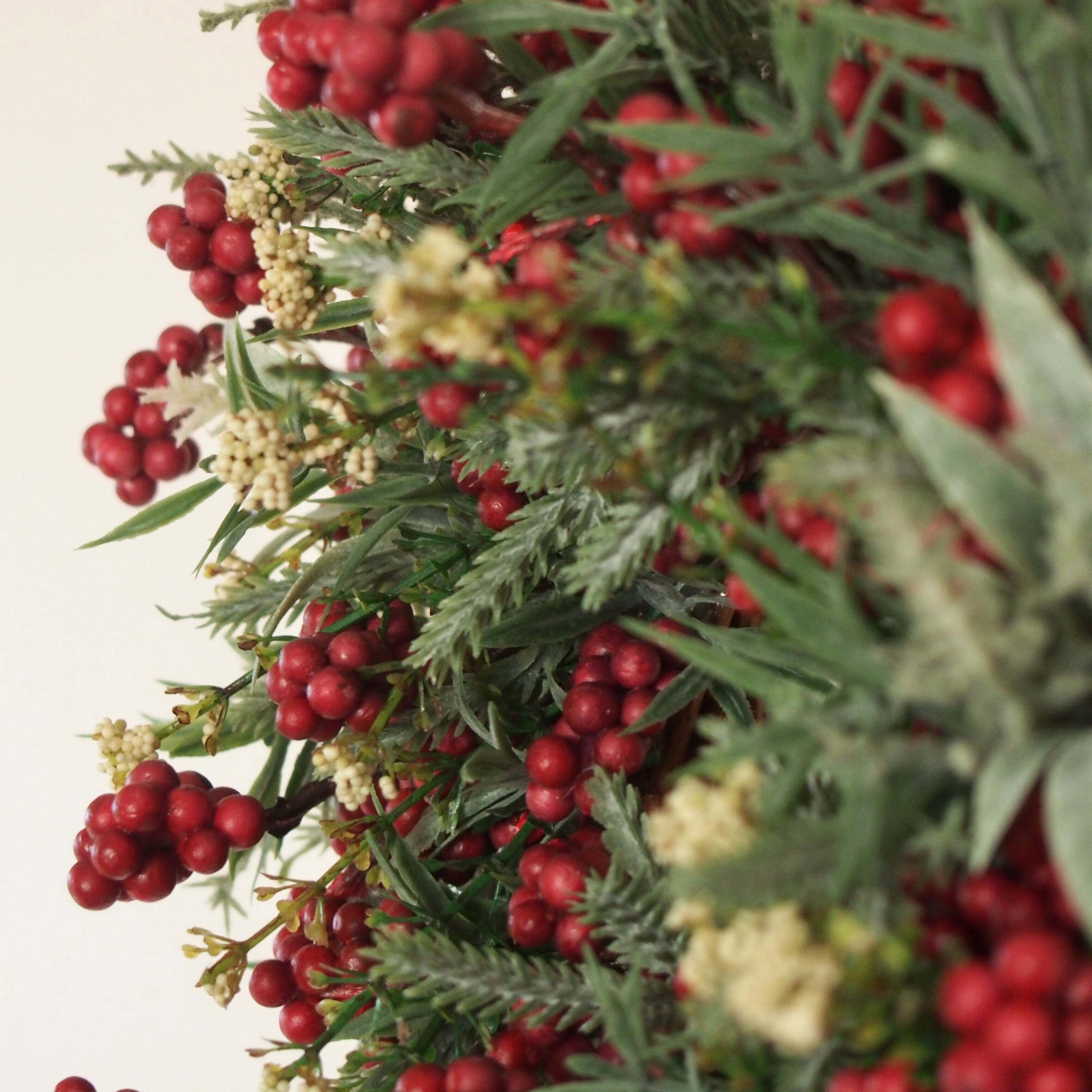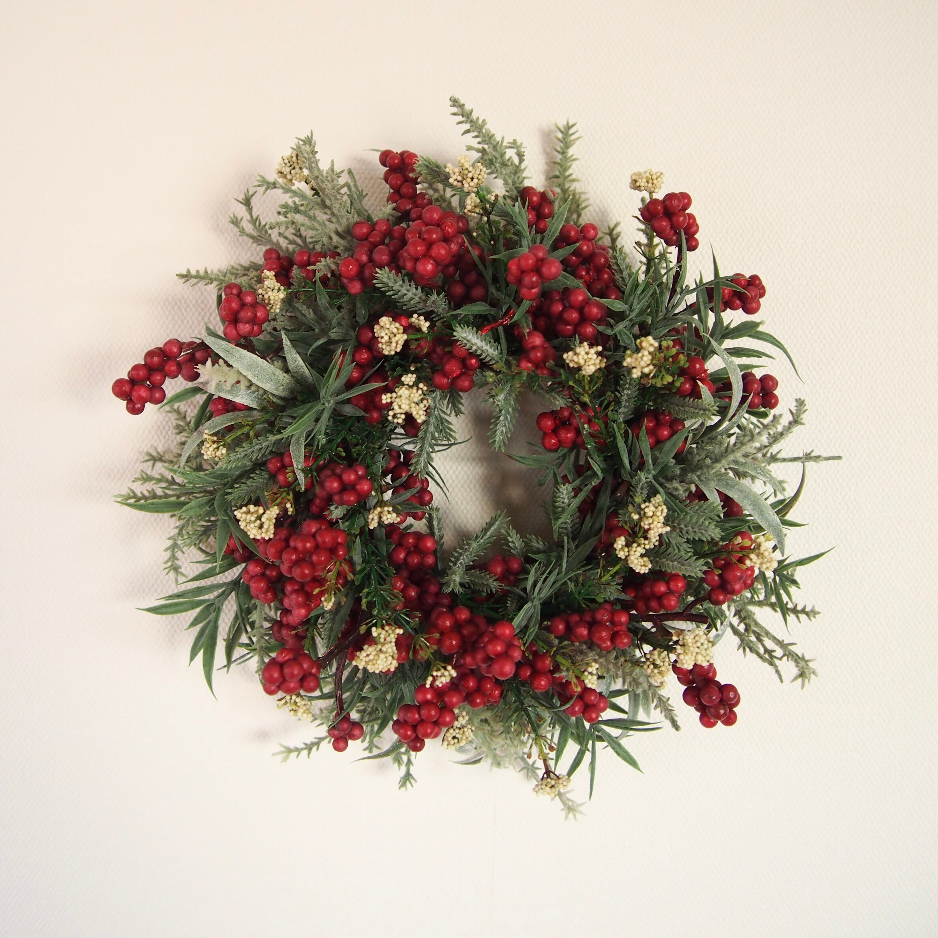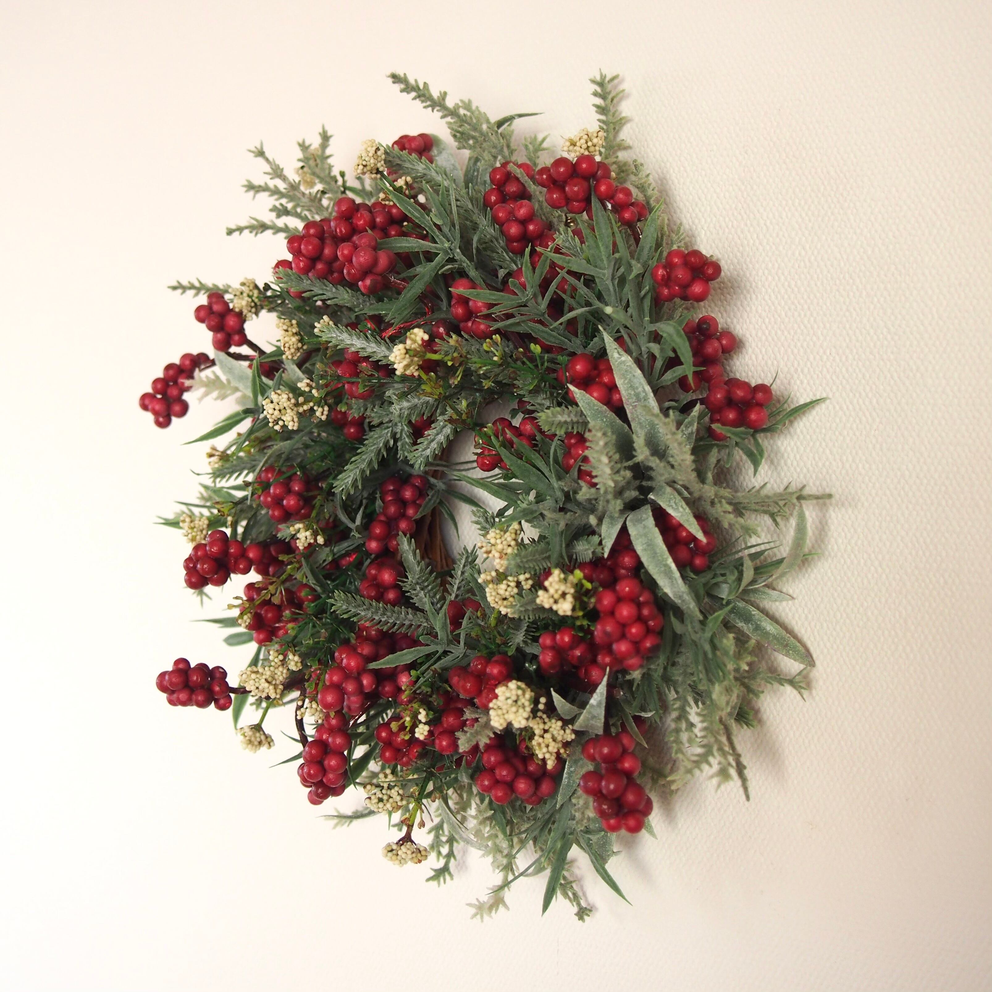 ◇ グリーンの中に赤い実を沢山散りばめ白い花がアクセントとなっているリース。その木の実やグリーンは作者のハンドペイントで同じものは世界に2つとない仕上がりです。少し小ぶりなので飾り易く、赤い実がメインなので年始にも最適。大事に扱えば何年も一緒に年越しが出来るのもアーティシャルフラワーの魅力ですね。