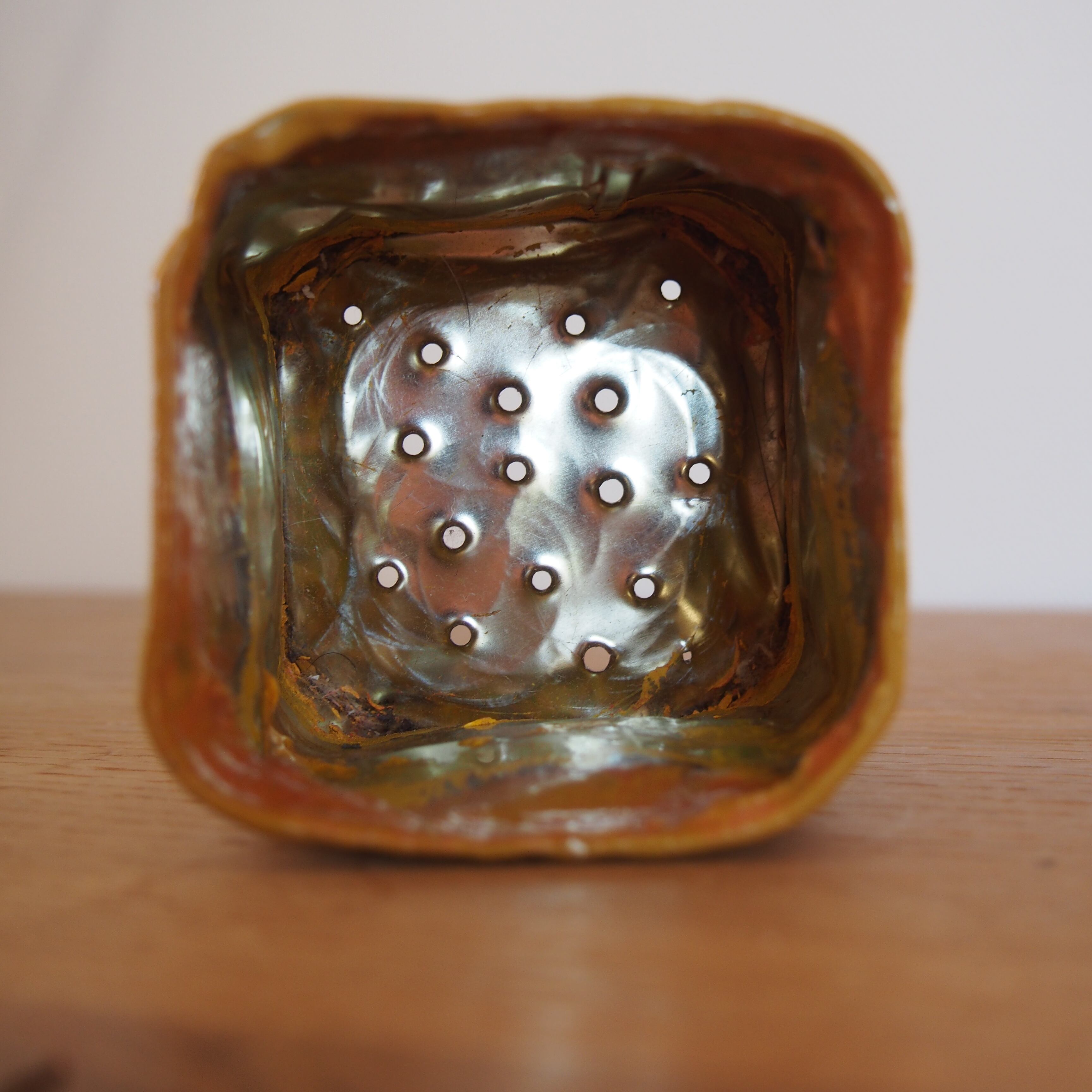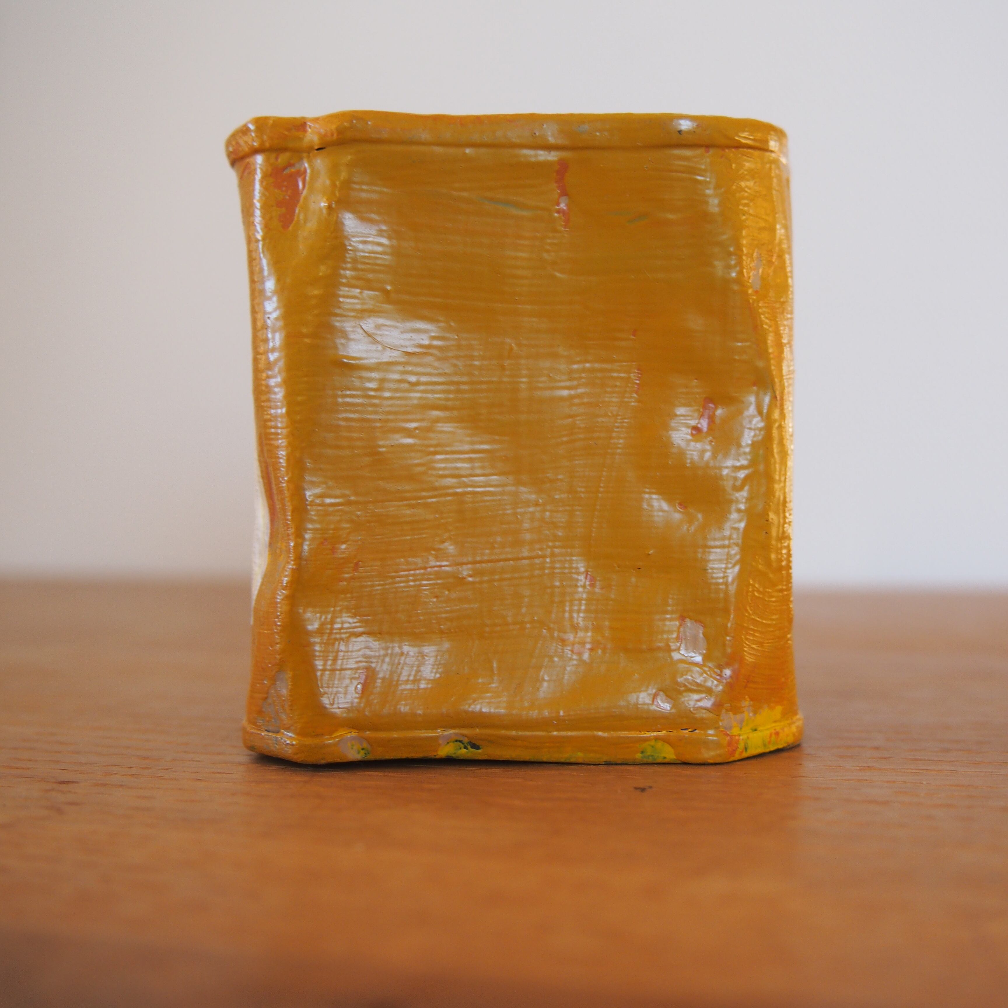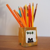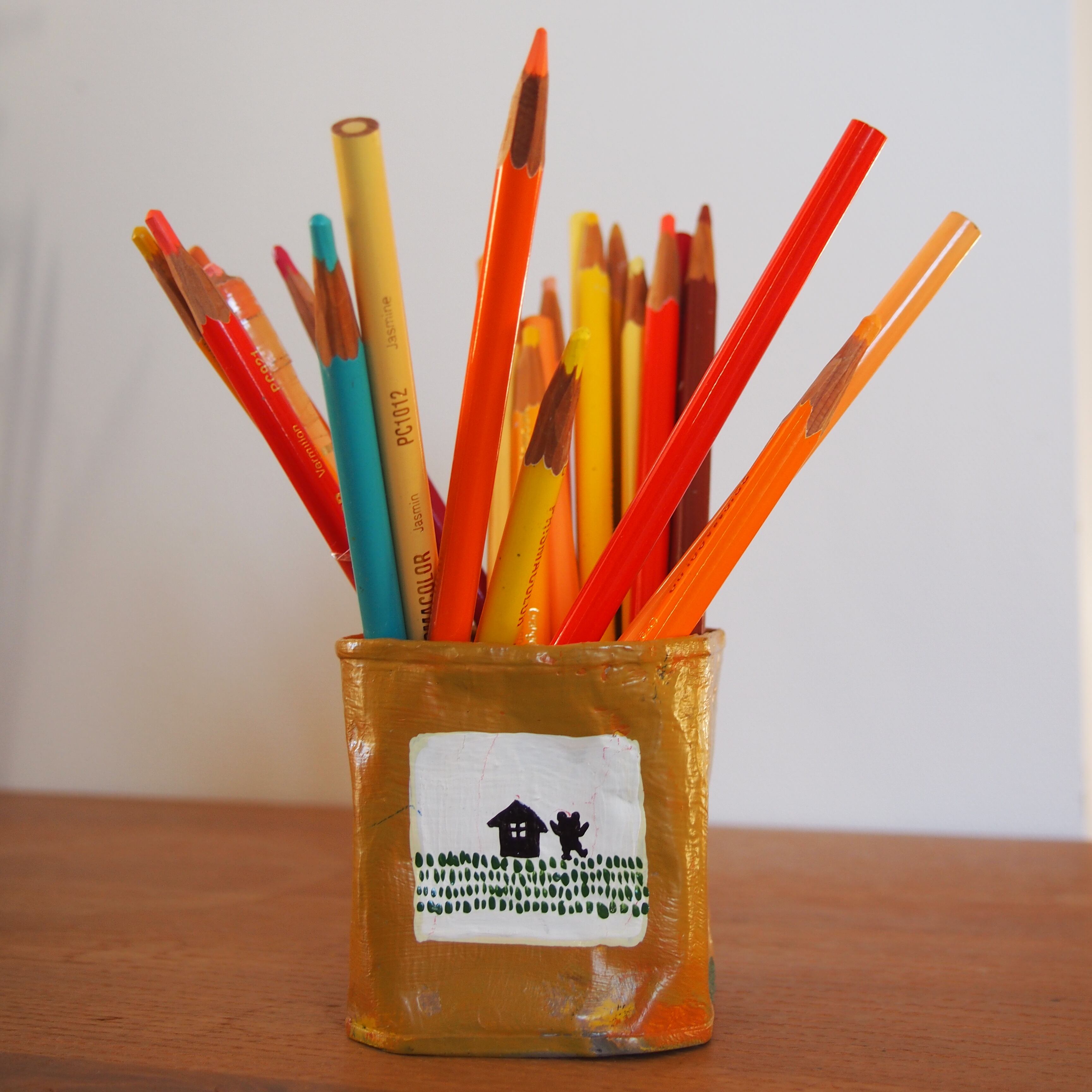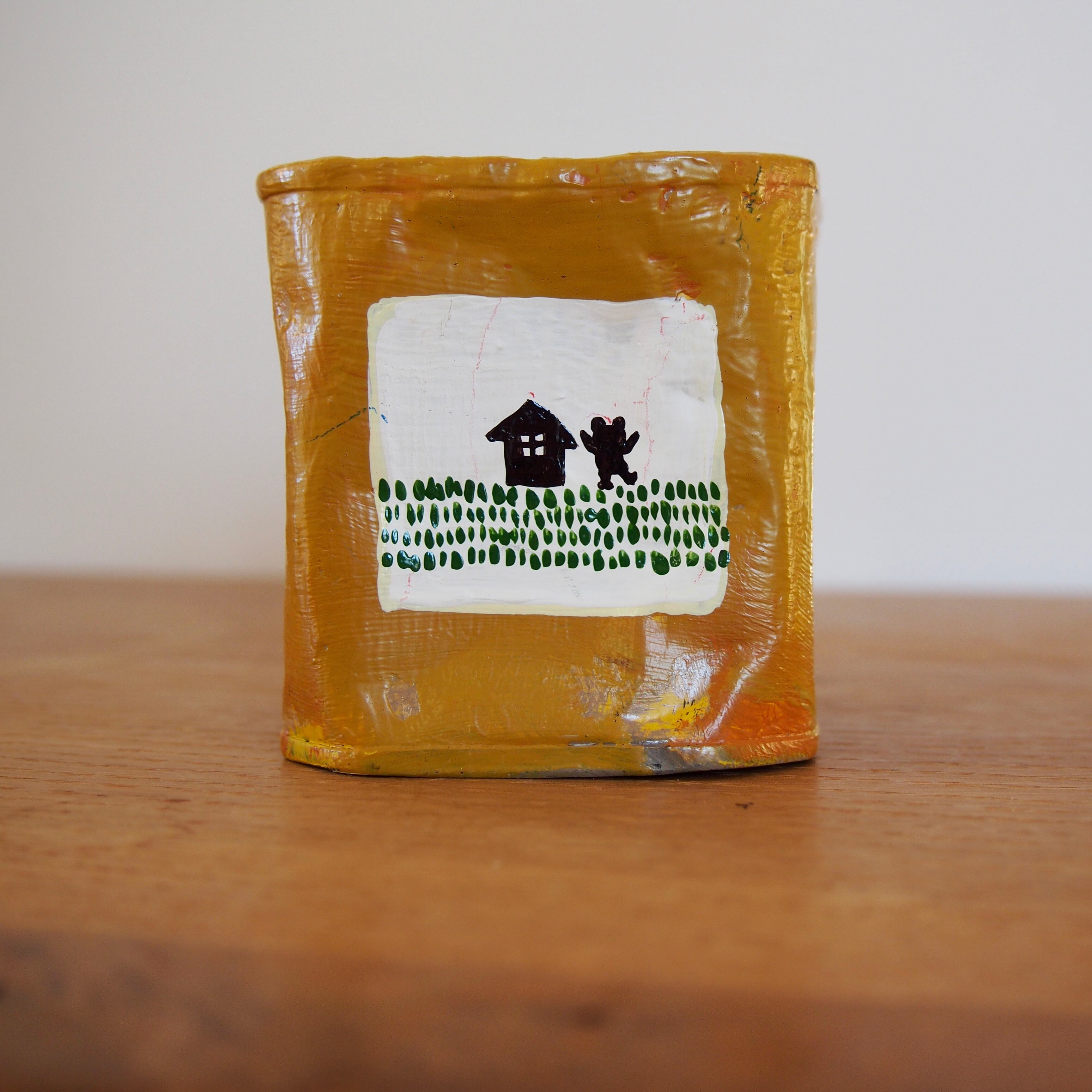 ◇どこにでもあるcanを使ってハンドメイドのcan box。おしゃれな鉛筆立てのようにも使えたり、底には水抜きの穴がついているので小さなプランターとしてもつかえます。デスクの上にこんな鉛筆立てがあるだけで幸せな気分になります。絵柄は半分顔を出して森を覗くクマさんと小さな家が描かれています。2013年4月の作品