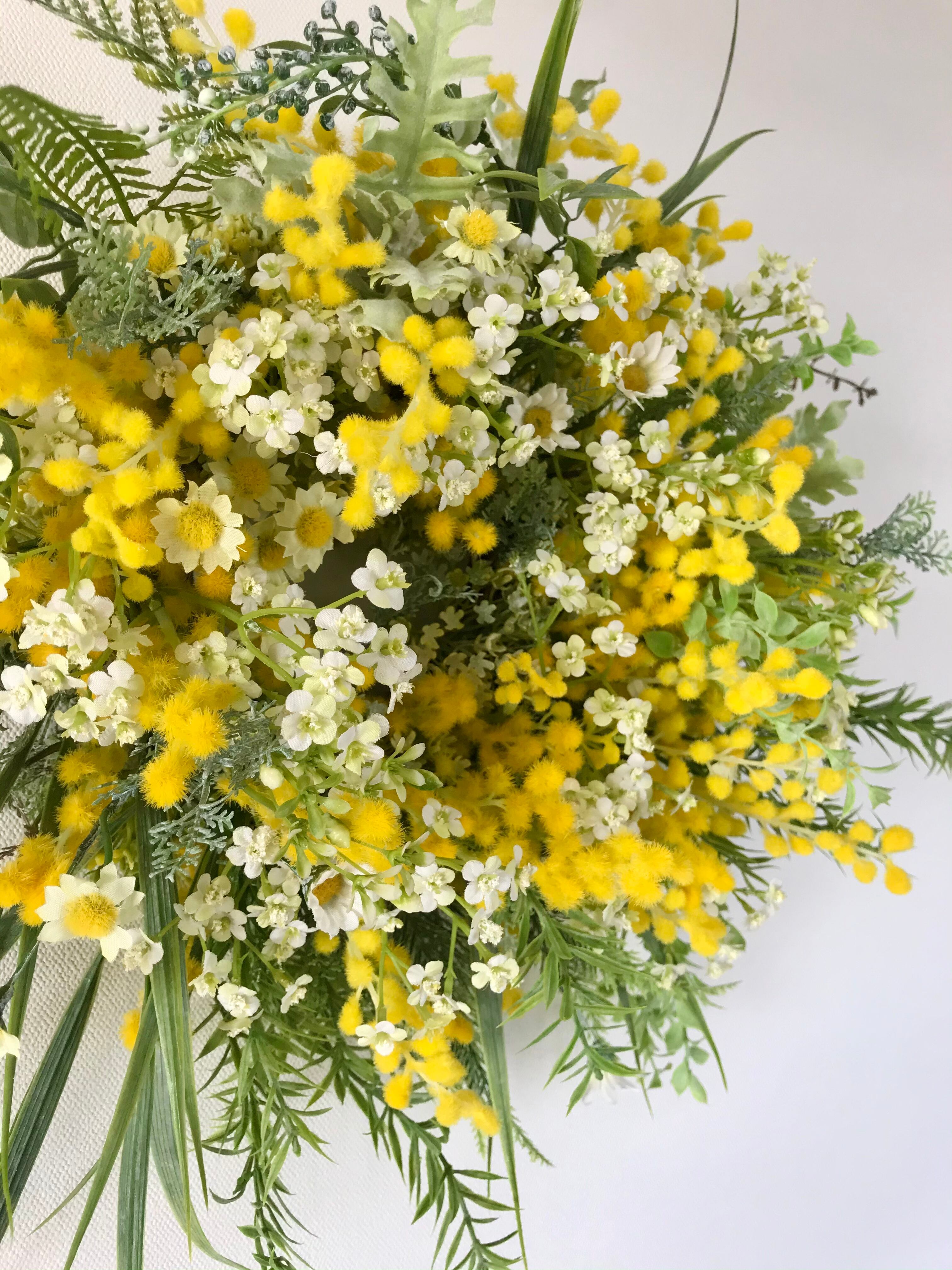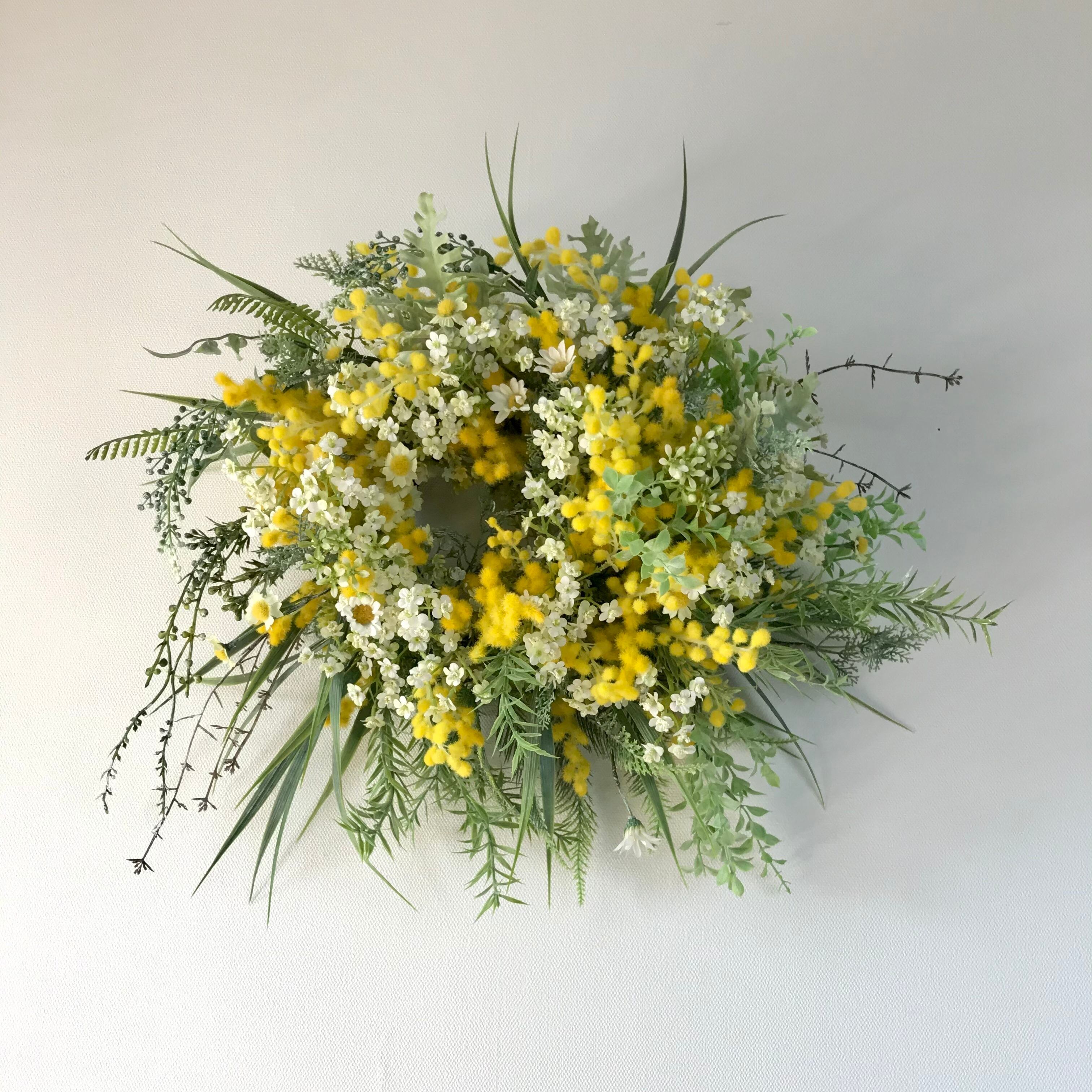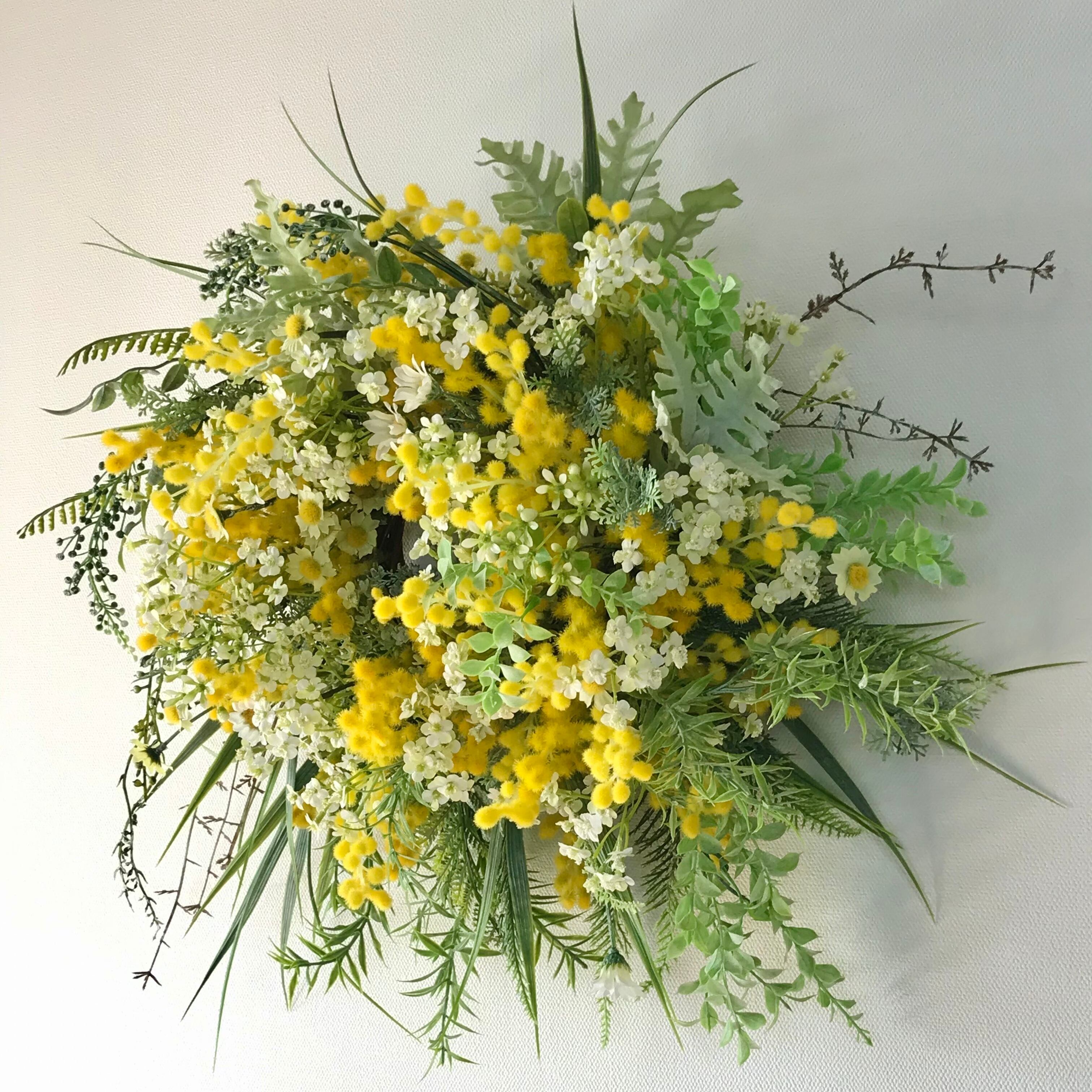 春のリース4つめは、ミモザ、カモミール、ベビーブレス、草々野々花を摘みとったようなナチュラルなリース。春の穏やかな暖かみと大胆で野生的な一面をハンドメイドで作り出した大きめのリースです。木調ベースの壁や店舗に映える仕上がりです。