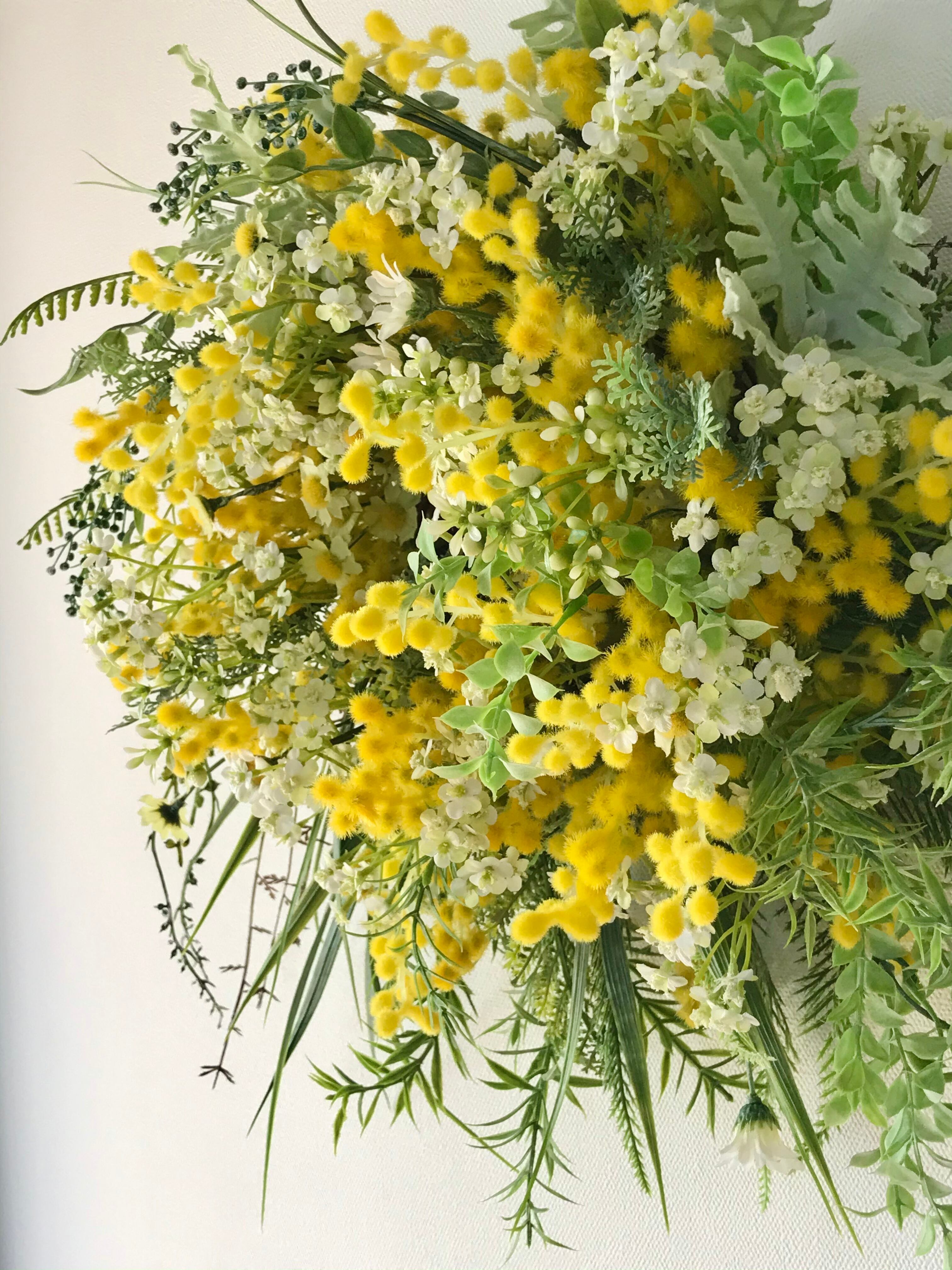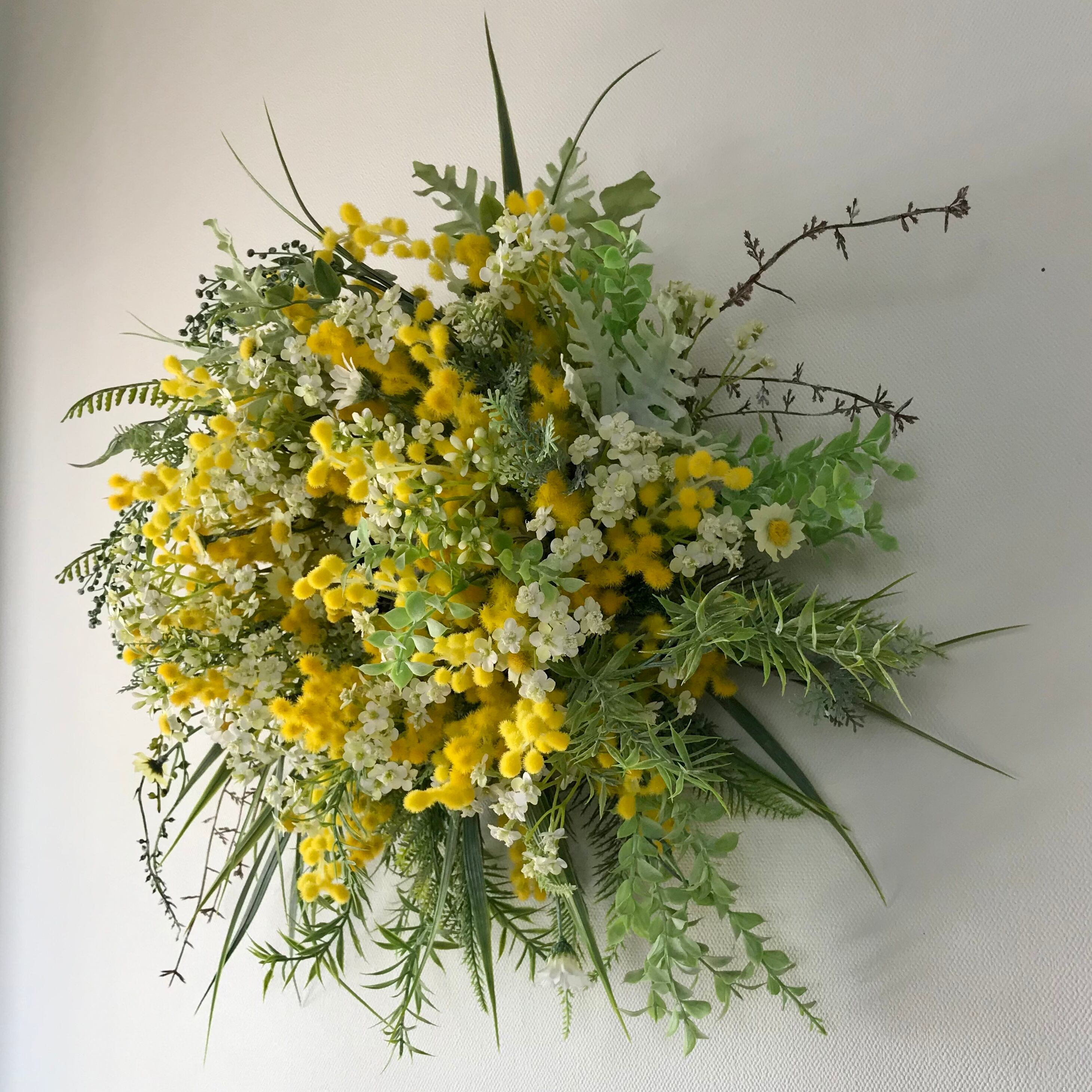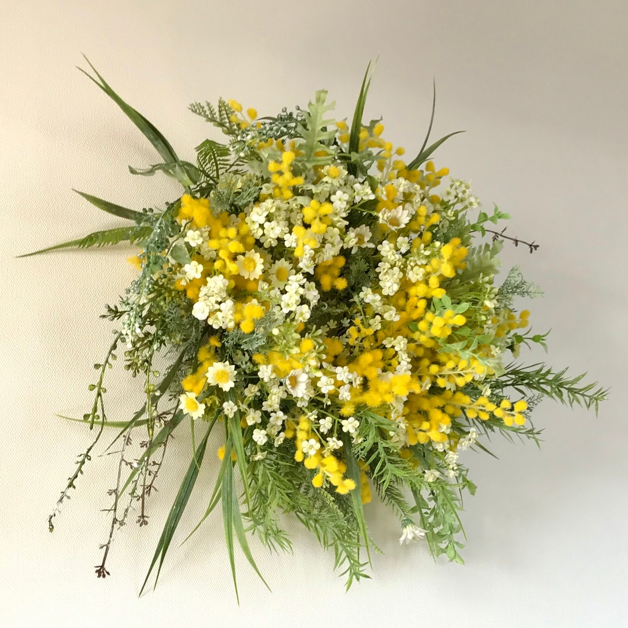 春のリース4つめは、ミモザ、カモミール、ベビーブレス、草々野々花を摘みとったようなナチュラルなリース。春の穏やかな暖かみと大胆で野生的な一面をハンドメイドで作り出した大きめのリースです。木調ベースの壁や店舗に映える仕上がりです。